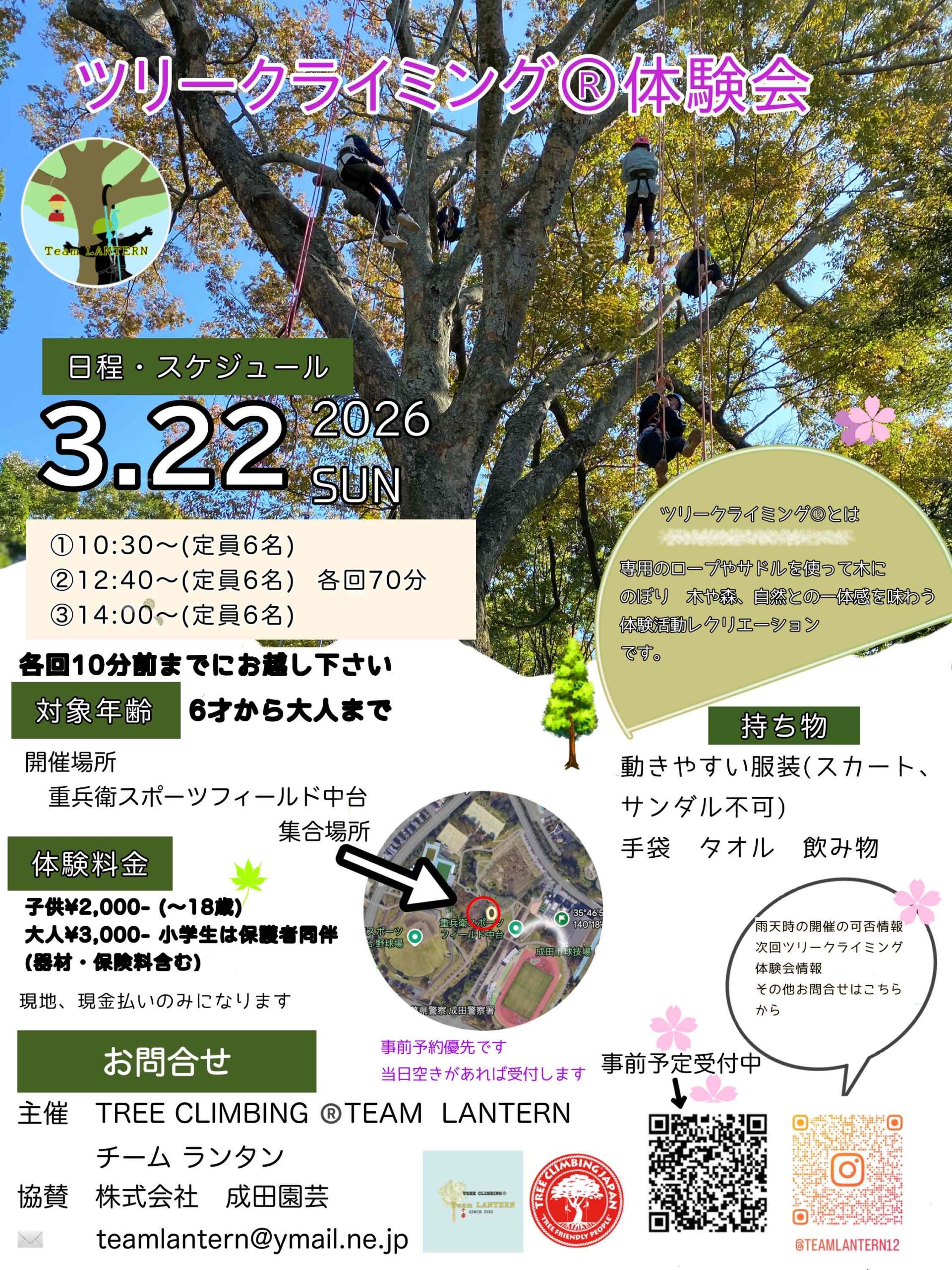 | 2026年3月22日(日) | 千葉県成田市「重兵衛スポーツフィールド中台」 | TreeClimbing®Team Lantern/株式会社成田園芸 | 詳細はこちら |